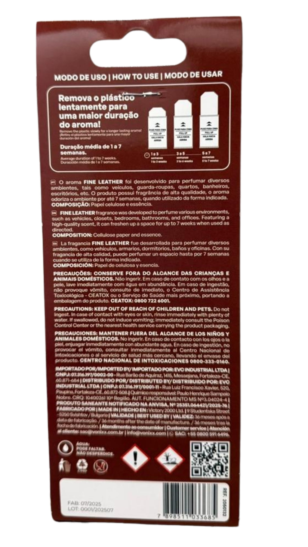 O Aroma para Carro Vonixx Fine Leather traz uma fragrância sofisticada e marcante, inspirada no cheiro elegante do couro refinado. Ideal para quem busca um aroma mais intenso e requintado, proporcionando sensação de conforto, luxo e limpeza ao interior do veículo.